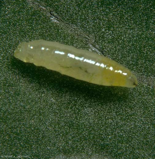 - L3 : toujours blanc cassé, mais sa tête est jaune et le tube digestif et son contenu, vert-noir (figure 3). La larve de troisième stade mesure au départ environ 2 mm, puis grandit.