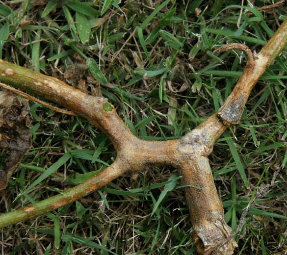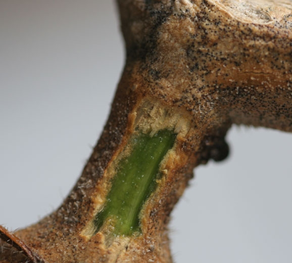 - des altérations chancreuses sur le collet et la tige (figures 1 à 5). Celles-ci sont souvent vert foncé et humides en début d'attaque et peuvent mesurer entre 5 et 15 centimètres. On peut voir apparaître en surface des gouttelettes gommeuses ambrées, s'assombrissant en s'oxydant (figures 6 et 7). Par la suite, ces lésions se dessèchent, subérisent, prennent une teinte brunâtre, et sont parsemées parfois d'une multitude de microsclérotes noirs (50 à 200 µm) (figures 8 et 9) et de pycnides. Notons que les lésions sur tige rappellent celles occasionnées par Didymella bryoniae ;