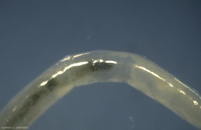 les nématodes recherchent activement les proies et pénètrent dans celles-ci (figures 1 et 2). Ils se nourrissent de leurs proies, ce qui entraîne l'émergence de bactéries spécifiques du système intestinal des nématodes. Ces bactéries transforment les tissus de l’hôte en produits qui peuvent facilement être assimilés par les nématodes. Les larves meurent en quelques jours.