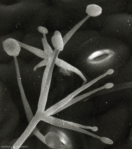 Après avoir pénétré la cuticule de l'insecte, les spores de L. muscarium germent sur l'insecte et on observe des filaments de mycélium (figure 1). Le champignon a une apparence cotonneuse blanche. Leurs extrémités présentent de petits ballons dans lesquels se trouvent une ou plusieurs conidiospores (figures 2), entourées d'une substance collante. Les spores sont ensuite disséminés par par l'eau ou par des actions mécaniques afin d'infecter de nouveaux organismes (figures 3).