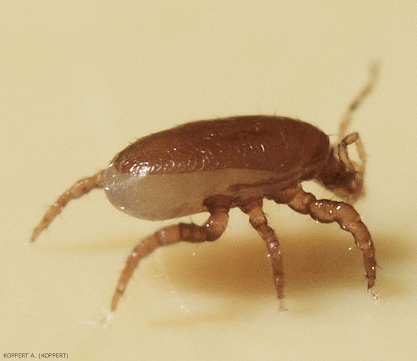 L'adulte (figure 1 et 2) mesure 0.6 à 0.8mm, et est de couleur brune. Les larves et le premier stade larvaire sont blancs.