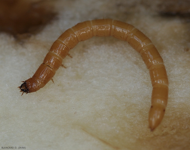 - Les larves (figures 1 et 2), nommées "vers fil de fer" car elles ressemblent à des vers, possèdent 3 paires de pattes. Elles sont de forme allongée, avec une tête brune aplatie, et peuvent mesurer de 2 à 25 mm de long suivant leur âge. Elles sont de couleur jaune paille et possèdent une carapace rigide et bien segmentée.