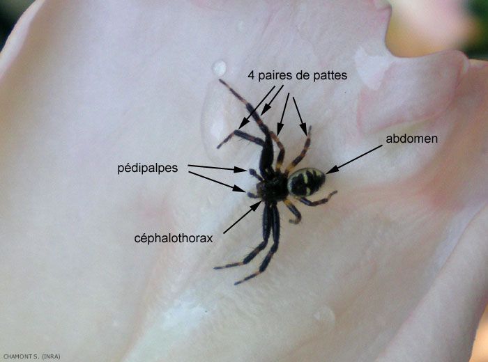 Les araignées (spider) appartiennent à l'ordre des Aranae (aranéides). Comme chez les acariens, le prosome est composé de la tête et du thorax soudés entre eux et portant les quatre paires de pattes composées de 7 articles. Jusqu'à 8 yeux simples sont insérés sur le prosome ainsi que des pédipalpes servant à la manipulation des proies (figure). Les araignées ne possèdent pas de pièces buccales broyeuses mais injectent par les chélicères (ou crochets) placés près de l'ouverture buccale du venin pour immobiliser leur proie ainsi que des enzymes digestives qui vont liquéfier celles-ci qu'elles vont ensuite aspirer.