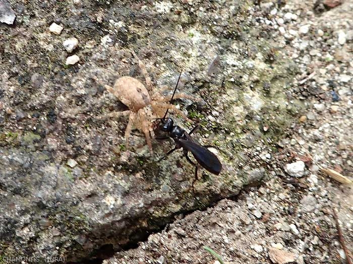 Les araignées sont elles-même chassées par des hyménoptères de la famille des Pompilidae (figure). Ces insectes parasitoïdes, après avoir attrapé leur proie, la paralyse, puis pondent un oeuf unique dont la larve se nourrira pour effectuer son développement.