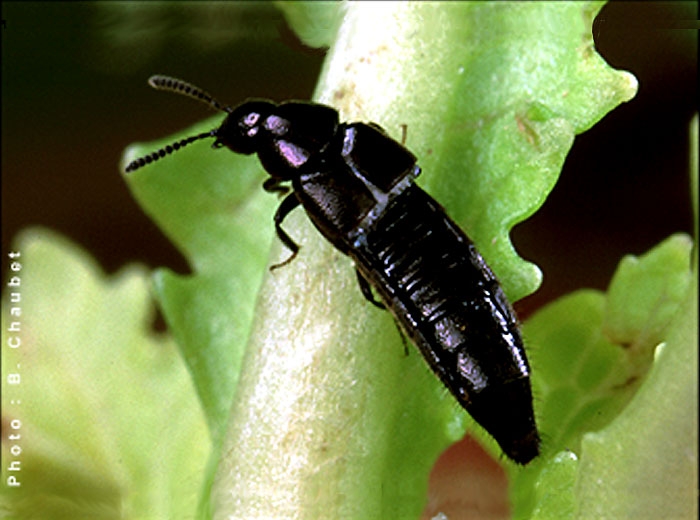 Aleochara bipustulata mesure également 5-6 mm de long. Il est noir, avec des minuscules elytres rouges-brunes.