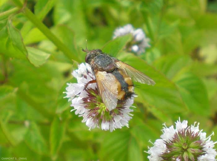 Ces plantes riches en terpènes ont des fleurs riches en nectar attirant les insectes auxiliaires à longue langue ou à trompe comme les papillons ou certains insectes pollinisateurs comme les mouches tachinaires parasites (photo). Hormis les plantes médicinales ou aromatiques telles que le thym, la sauge, le romarin remarquable pour sa floraison hivernale ou très précoce, des herbacées sauvages sont aussi intéressantes, par exemple le lamier pourpre (Lamium purpureum) à floraison de très longue durée. Proche des labiées on peut aussi citer la famille des Boraginaceae dont les fleurs sont riches en nectar.