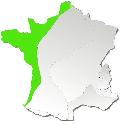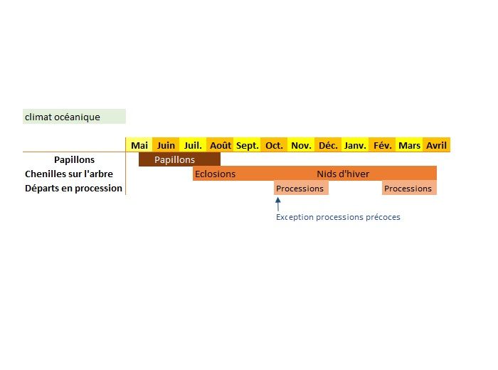 Les régions à climat océanique (figure 1) sont caractérisées par un vol très précose des papillons. A Marennes sur Oléron (17) par exemple, dès le 15 avril, des papillons de processionnaires du pin ont été observés. Dans ces régions, l'éclosion des chenilles a lieu très tôt au cours de l'été. Il est fréquent de rencontrer des chenilles de stades 2 et 3 dès le mois d'août et des stades 5 en octobre. Ainsi dans ces régions, une partie des chenilles arrivant à maturité avant l'hiver, vont partir en procession pour se nymphoser dans la terre, dès mi-octobre et les autres au cours du printemps. Ces particularités (figure 2) sont à prendre en compte dans les procédures de gestion.