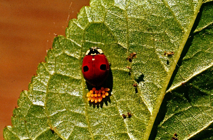 Les œufs d'Adalia bipunctata sont pondus dressés, en petits groupes (10-40) sur les feuilles, généralement près des colonies de pucerons (figure 1). L’émergence des larves (figure 2) dépend des conditions climatiques. Il n’y a qu’une génération chaque saison. Cependant, les adultes vivent longtemps, entre un et trois mois, et tous les stades de développement sont présents simultanément durant les mois d’été.
