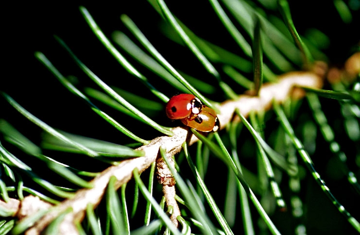 Les adultes d'Adalia bipunctata hivernent souvent agrégés en grand nombre dans des endroits abrités.