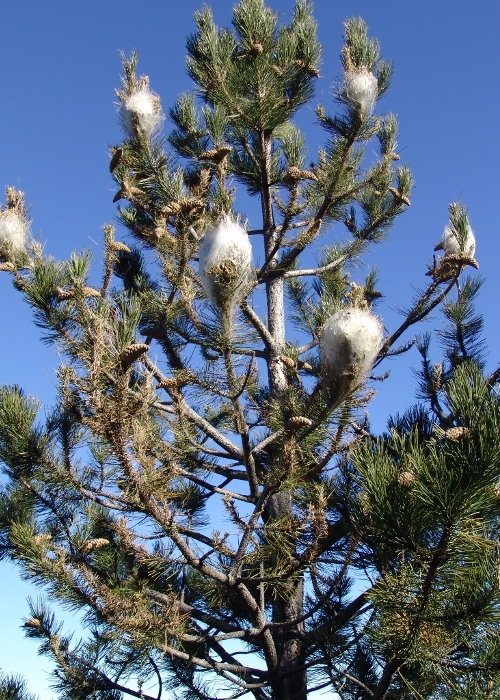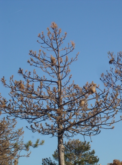 Les dégâts occasionnés par la processionnaire du pin peuvent être extrêmement important jusqu'à provoquer des défoliations totales de l'arbre (figure 6). Généralement, malgré cet affaiblissement, il ne subit pas de dommage vital. Néanmoins, l'accumulation de facteurs (stress hydrique, autre attaque d'insectes...) peut contribuer à la mort de l'arbre.