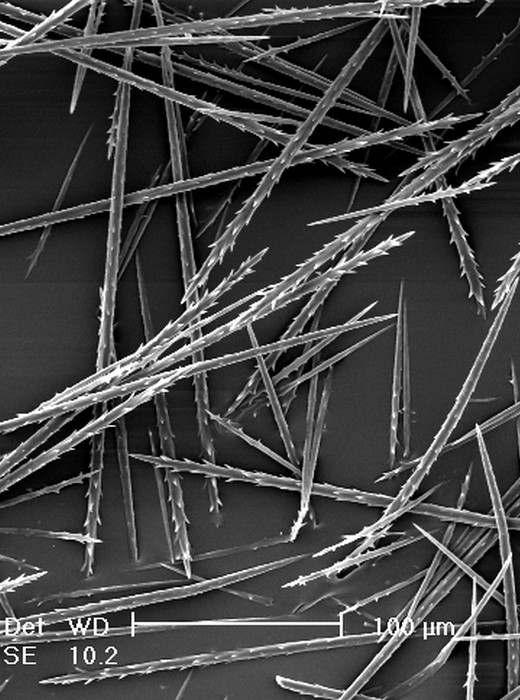 Quatre types d'atteinte peuvent être observées : cutanée (figure 1), oculaire (figure 2), respiratoire et allergique. L'atteinte cutanée provoque des démangeaisons, voire un œdème, et peut mettre jusqu'à deux semaines à disparaître. Si les soies, telles des fléchettes (figure 3) ne sont pas enlevées rapidement de l'œil, elles peuvent entraîner de graves conséquences : glaucome, cataracte… Enfin, suite à l'inhalation de poils, une petite gêne respiratoire peut se faire sentir, ou même dans certains cas une crise d'asthme.