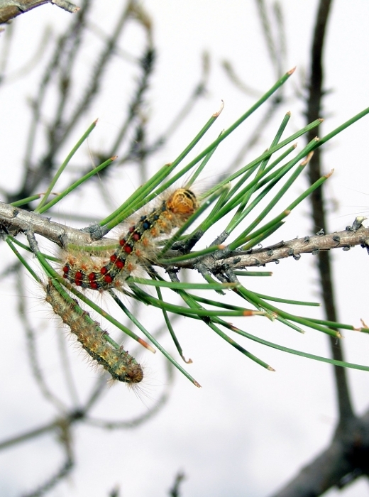 Le bombyx disparate (Lymantria dispar) (figure 1) est un ravageur inféodé aux chênes mais qui est très polyphage. Lorsque les chenilles de ce dernier, sont en grand nombre, elles peuvent aussi s'attaquer aux pins et aux autres résineux. Les chenilles des derniers stades larvaires sont reconnaissables par leurs paires de taches rouges et bleues. Les chenilles ne sont pas grégaires et peuvent se laisser suspendre par un fil de soie. La nymphose a lieu généralement sur l'arbre et la chrysalide est supendue par un fil de soie. Les pontes recouvertes d'écailles (figure 2) peuvent se trouver sur le tronc, mais aussi sur n'importe quel support (pierres, rochers, murs et murets...). Il n'y a pas de confusion possible avec les pontes de processionnaire du pin disposées en long manchon.