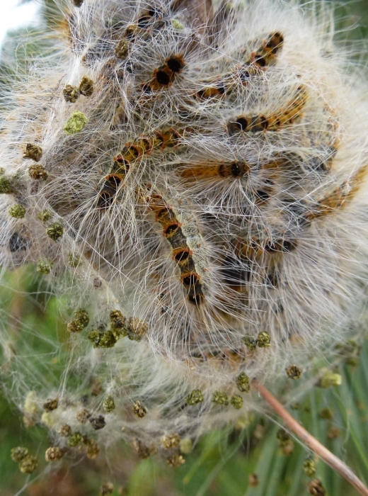 La processionnaire d'été (Thaumetopoea pinivora) (figure 3) est aussi une processionnaire dont les chenilles se nourrissent du pin. Présentes dans les pins d'altitude, elle est néanmoins assez rare en France. Elle peut être confondue avec la processionnaire du pin (Thaumetopoea pityocampa). Son cycle permet de différencier les 2 espèces. En effet, Thaumetopoea pinivora passe tout l'hiver au stade oeufs . Dès le printemps, les chenilles vont éclore et se développer. La nymphose a lieu début juillet. A l'inverse, la processionnaire dite du pin (Thaumetopoea pityocampa) a une évolution larvaire durant l'hiver (éclosions des pontes en cours ou en fin d'été). Ces deux espèces sont grégaires mais les chenilles de T. pityocampa vivent dans un nid de taille variable au cours de l'hiver qui protége la colonie tandis que celles de T. pinivora vivent au printemps à l’air libre au niveau des branches ou des aiguilles de pins.