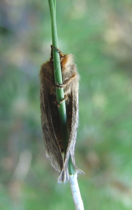 Au bout de quelques heures, la femelle se pose généralement sur un pin pour la ponte qui se fera autour de deux aiguilles. La ponte a une forme de manchon et mesure près de cinq centimètres de long (figure 8). Elle peut contenir entre 70 et 240 œufs, la moyenne se situant aux alentours de 200 œufs. Ceux-ci sont recouverts d’écailles provenant de l’extrémité de l’abdomen de la femelle. Au cours de la même nuit où la suivante, mâles et femelles vont mourir.
