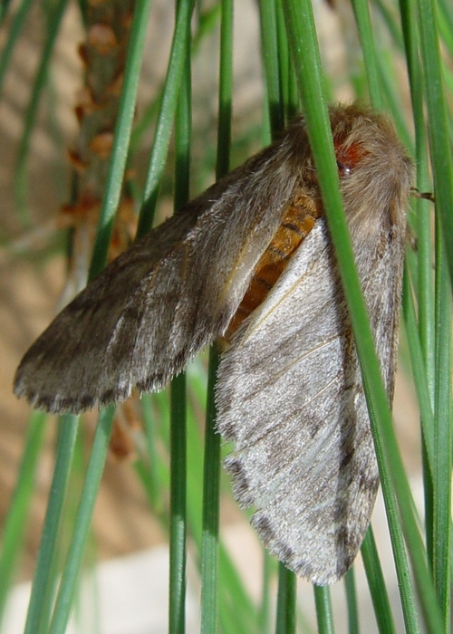 L’émergence de l'adulte de la processionnaire du pin (Thaumetopoea pityocampa), le papillon (figure 1), a lieu pendant la nuit, au cours de l'été (variable suivant les climats). Les mâles émergent environ une demi-heure avant les femelles. La sortie du cocon se fait grâce à la présence de crêtes sclérifiées (canthus) situées sur la tête du papillon (figure 2), qui « découpent » l’enveloppe. Le ratio mâle/femelle est généralement proche de 1. Les imagos mâles (figure 3) sont plus petits que les femelles (figure 4).