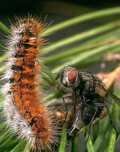 Plusieurs diptères sont aussi connus comme prédateurs (syrphides) (figure 5) ou parasites (mouches tachinaires) (figures 6 et 7) du stade chenille. Des champignons entomopathogènes présents dans les sols comme Beauveria bassiana (figure 8) ou Cordyceps militaris (figure 9) vont aussi contaminer l'insecte et provoquer sa mort. Bactéries (Bacillus thuringiensis) (fugure 10) et virus (Smithiavirus pityocampae) (figure 11).