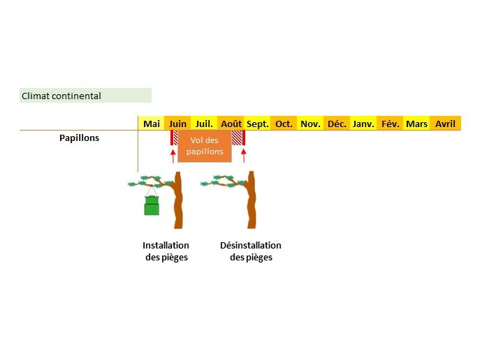 Si vous vous trouvez dans une région avec un climat de type continental, comme présenté dans la figure 1, les dates d’installation et de désinstallation des pièges à phéromone sont spécifiées dans la figure 2. Il faut toujours compter un lapse de temps suffisant entre la pose des pièges et le début du vol des papillons, ainsi qu’entre la fin du vol et la date de démontage des pièges, afin d’optimiser l’efficacité du piégeage.