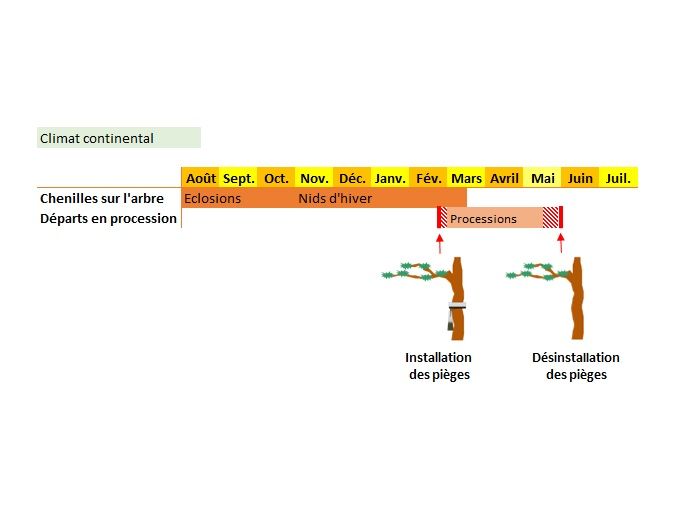 Si vous vous trouvez dans une région avec un climat de type continental, comme présenté dans la figure 1, les dates d’installation et de désinstallation des pièges à chenilles sont spécifiées dans la figure 2. Il faut toujours compter un lapse de temps suffisant entre la pose des pièges et le début de la procession des chenilles afin d’optimiser l’efficacité du piégeage.