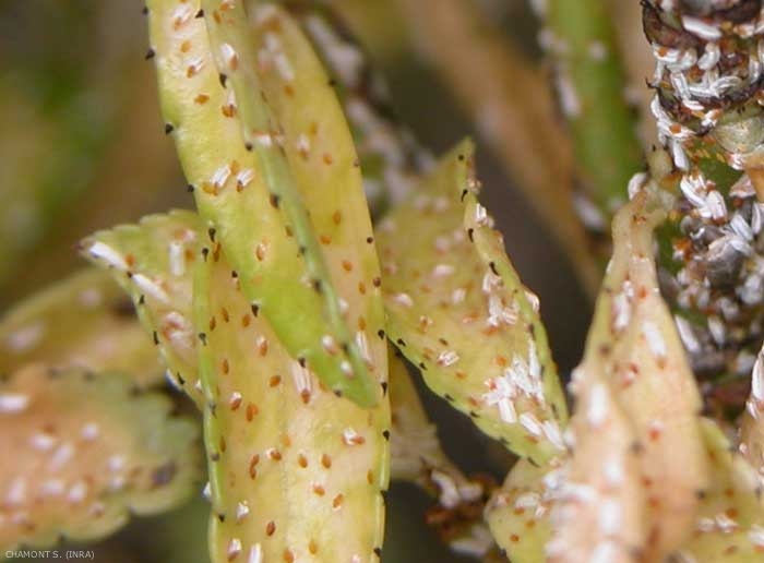 Pendant l’été, les feuilles attaquées par le ravageur présentent des lésions en forme de taches jaunâtres ou blanchâtres le long de la nervure médiane de la feuille.