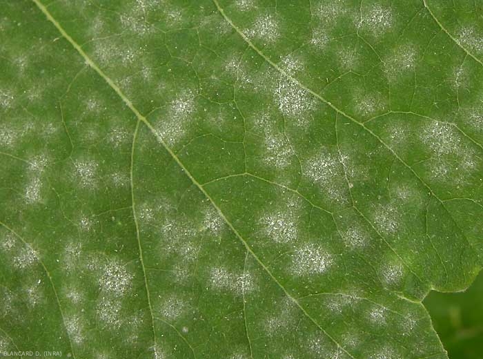 Les champignons attaquent surtout les feuilles, du début de l’été au début de l’automne. Des taches blanches et poudreuses s’étendent jusqu’à recouvrir toute la surface des feuilles (figures 1 à 3), sur les deux faces, en commençant par la face supérieure. Le limbe peut à terme jaunir plus ou moins (figure 4).