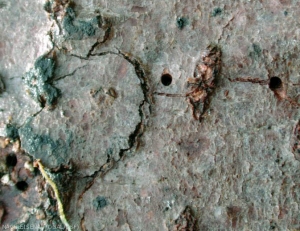 - Présence d'écoulements de résine à l'entrée des galeries d'hivernation (automne) ou des galeries de ponte (printemps, été)