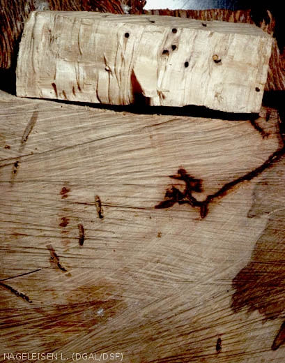 - Sciure blanche composée de très petits copeaux de bois, expulsée sur l'écorce au cours de l'activité de forage