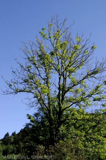 Dans le houppier, les arbres atteints présentent des flétrissements et/ou des nécroses du feuillage, des mortalités de rameaux, des nécroses corticales et des faciès chancreux, associés à une coloration grise du bois sous-jacent. Les flétrissements des pousses s’observent au début de l’infection. Le déficit foliaire et les mortalités de pousses, rameaux et branches qui apparaissent rapidement sont en corrélation étroite avec la fréquence de nécroses de l’écorce.