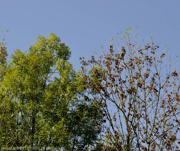 - il y a une diversité dans l'apparition des symptômes de la maladie au sein d'un même peuplement, l'aspect de certains frênes se détériore, d'autres montrent peu de symptômes et/ou se dégradent peu. Une amélioration de l’état sanitaire de certains arbres a même été évoquée, en liaison probablement avec l'apparition de gourmands et des petites branches et rameaux morts qui tombent, reconstituant un houppier qui paraît moins atteint, surtout en fin d'été ;
