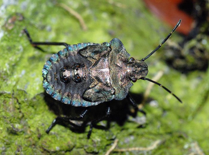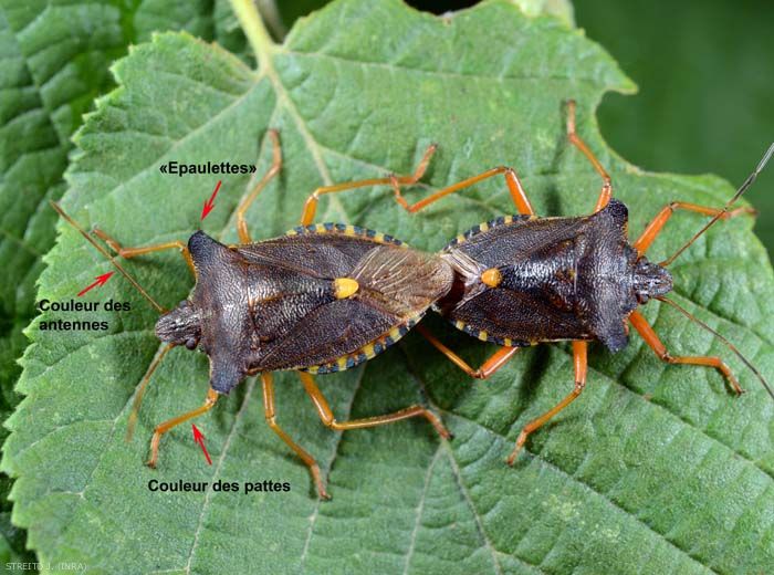 Il s’agit d’une punaise de taille similaire à celle de la Punaise diabolique mais la forme du pronotum est bien différente : ses bords latéraux forment des sortes d’épaulettes. La coloration est différente notamment celle des pattes qui sont orangées et des antennes sans anneaux pâles.(fig 1-2-3).