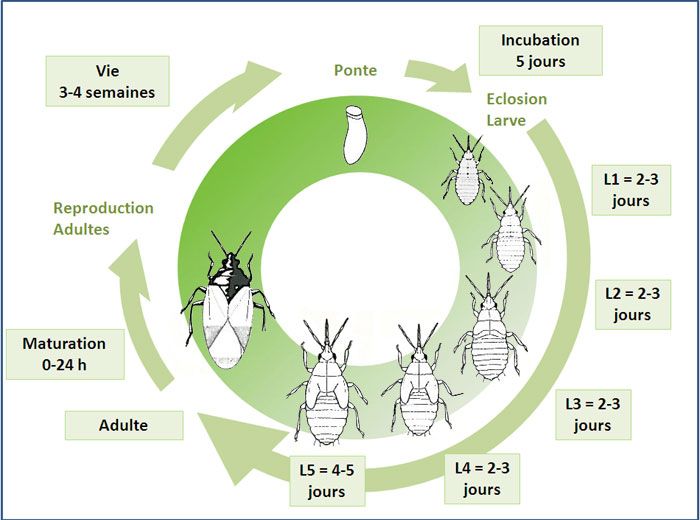 O. majusculus entre en diapause et ne peut être introduit efficacement qu’à partir du printemps. Si on installe cette punaise prédatrice au début de l’année, une génération de larves est produite, mais les adultes émergents entrent en diapause.