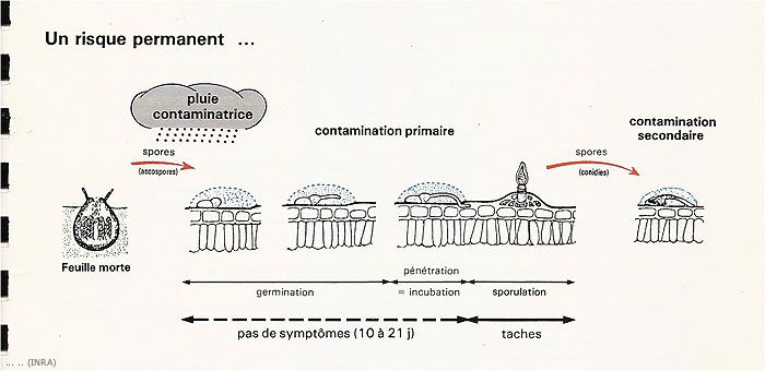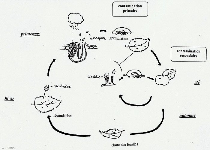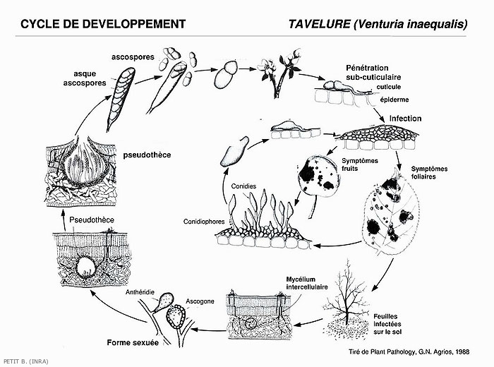 Le cycle biologique de Venturia inaequalis comprend 2 phases : une phase saprophytique dans les feuilles mortes au sol et une phase parasitaire sur les feuilles et les fruits (Figures 1 et 5)