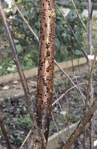 Nécrose brune déprimée et fendillement de l'écorce. Les nécroses peuvent devenir ceinturantes et causer la mort de la tige infectée.