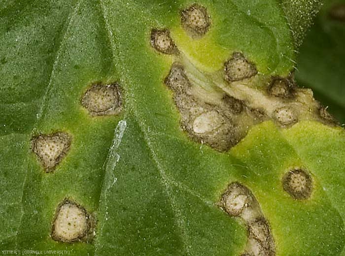 Les symptômes induits par Septoria lycopersici sont parfois confondus en début d’évolution avec ceux notamment de l’alternariose. Ainsi, des petites taches circulaires, humides dans un premier temps, apparaissent sur le limbe des vieilles feuilles. Elles s’étendent légèrement, prennent une teinte brune et restent limitées à un diamètre de 2 à 6 mm (figures 1 et 2). Un halo chlorotique les ceinture plus ou moins et leur centre se nécrose et prend une teinte hâlée à blanchâtre.