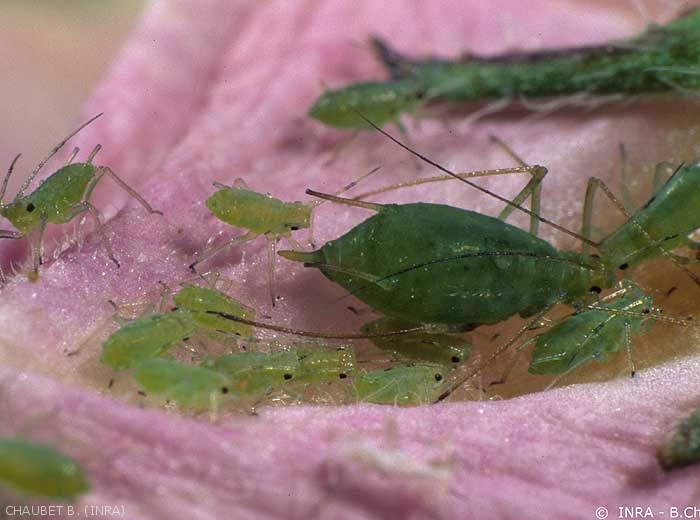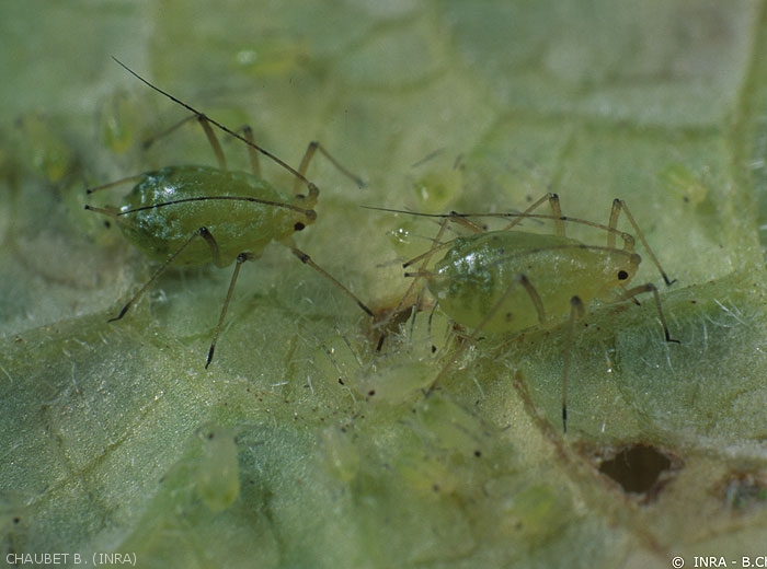 A ces espèces du feuillage, il convient d’ajouter Rhopalosiphoninus latysiphon (puceron des germes de pomme de terre) qui se multiplie sur les germes de pomme de terre dans les locaux de conservation et qui peut entraîner des baisses de vigueur germinative.