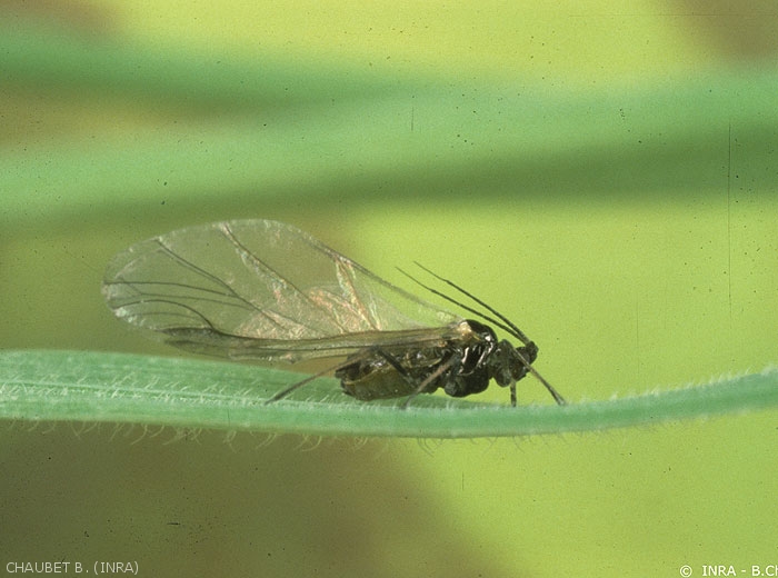 C’est le cas de pucerons des céréales, Rhopalosiphum padi (puceron du merisier à grappes - figure 11), Rhopalosiphum maidis (puceron vert du maïs), Schizaphis graminum (petit puceron des céréales), Sitobion avenae (puceron des épis) et d’autres cultures comme Brachycaudus helichrysi (puceron vert du prunier - figure 12), Phorodon humuli (puceron du houblon - figure 13), Cavariella aegopodii (puceron de la carotte - figure 14), Lipaphis erysimi (puceron du navet), Myzus certus qui sont parmi les espèces itinérantes les plus fréquemment citées en Europe de l’Ouest.