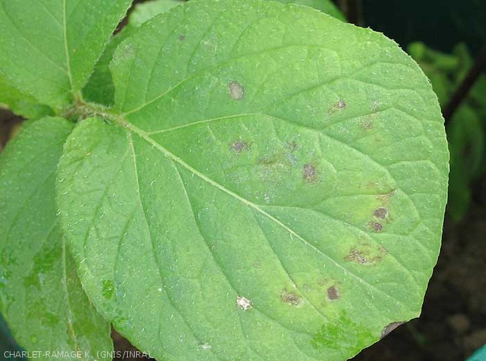 Le symptôme le plus caractéristique sur feuillage consiste en des chevrons jaune brillant devenant nécrotiques (figure 1), mais il n’apparaît pas très fréquemment dans les conditions de culture. Différentes formes de mosaïques et de marbrures évoluant en taches nécrotiques peuvent également se manifester (figure 2), assez souvent sur les feuilles d’une seule tige (d’où le nom anglais de « stem mottle » = « marbrure de la tige »). Chez certaines variétés, notamment Santé et José, l’infection totalement systémique se traduit par la présence de taches chlorotiques, parfois halotiques (figure 3), à tendance jaune pouvant se manifester sur l’ensemble de la plante.