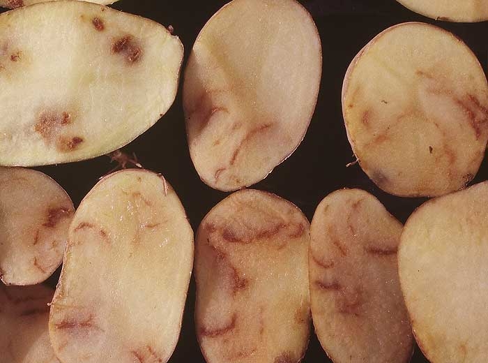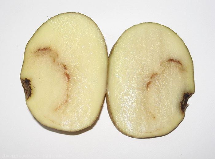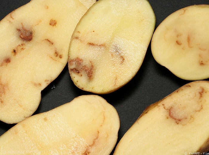 Les symptômes les plus typiques du TRV apparaissent le plus souvent à l’intérieur des tubercules (figures 4 et 5). Ce sont des arcs nécrotiques assez marqués ou des lignes sinueuses plus irrégulières (figures 6 à 11), pouvant s’élargir sous forme de taches liégeuses s’étendant à une grande partie du tubercule.
