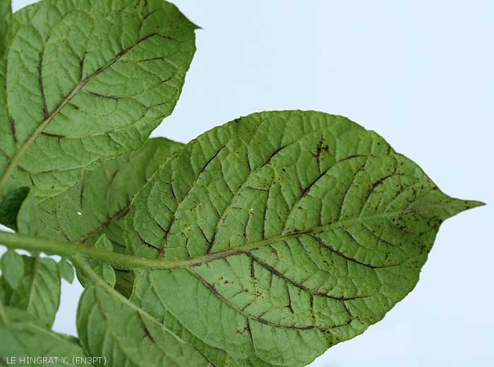 Une contamination au champ durant l’année en cours (infection primaire) se manifeste dans le cas des isolats PVYO par l’apparition de nécroses nervaires ou de taches nécrotiques brunes à noires (figure 1), à la face inférieure des feuilles. Les feuilles deviennent cassantes et se dessèchent, en restant attachées à la plante (d’ou l’appellation anglaise de leaf-drop symptom). L’infection primaire peut aussi provoquer une mosaïque déformante ou frisolée, souvent localisée sur une tige ou partie de plante.