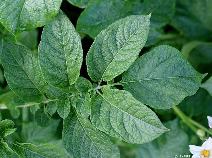 Les isolats de type PVYN-W induisent sur pomme de terre des symptômes légers (notamment en contamination primaire), de type mosaïque légère avec parfois un enfoncement des nervures (figure 12).