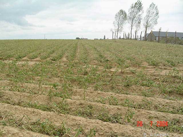 L’importance des dégâts dépend de l’intensité de l’averse de grêle subie. A l’extrême, la surface foliaire est presque totalement détruite (figures 1 et 2) avec de nombreux impacts sur les tiges qui se retrouvent « lacérées » (figures 3 et 4). Dans certains cas, on note l’impact direct des grêlons sur les tubercules (flancs ou dessus de buttes). Une protection anti-mildiou adaptée est nécessaire.