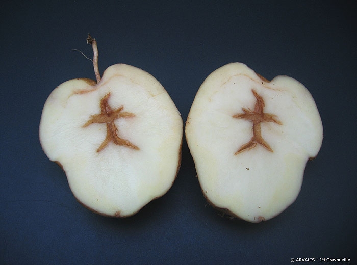 Le cœur brun débute par une tache nécrotique de couleur marron à l’intérieur de la moelle des tubercules. Lorsque son extension est importante, elle envahit la presque totalité de ce tissu et une fissure se forme en son centre, mais elle n’évolue pas toujours dans ce sens et peut demeurer à l’état de tache brune (figures 1 et 2).