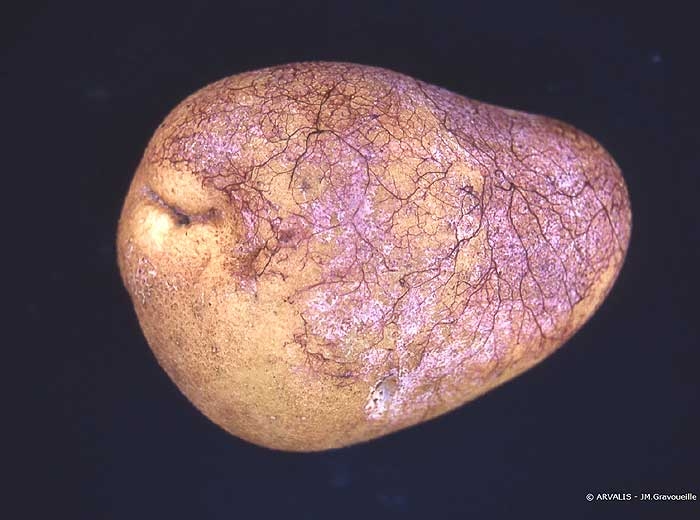 Le mycélium pénètre ensuite dans le tubercule, l’épiderme se crevasse, la chair se transforme en pourriture sèche plus ou moins grisâtre et le tubercule finit par se déliter complètement (figures 6 et 7).