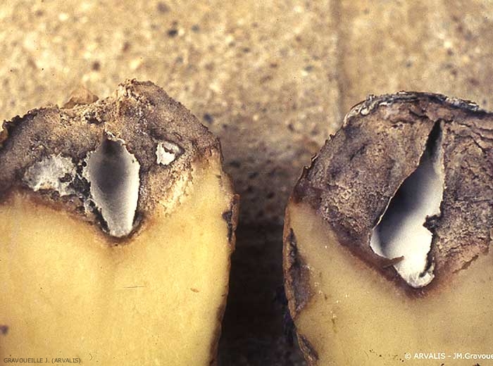 La coupe du tubercule montre une pourriture marron qui se développe vers l’intérieur où des cavités internes tapissées de mycélium apparaissent (figures 3 et 4). Le tubercule peut se dessécher progressivement jusqu’à donner un tubercule « momifié » de consistance dure.