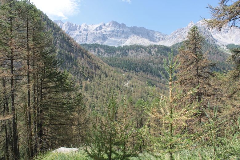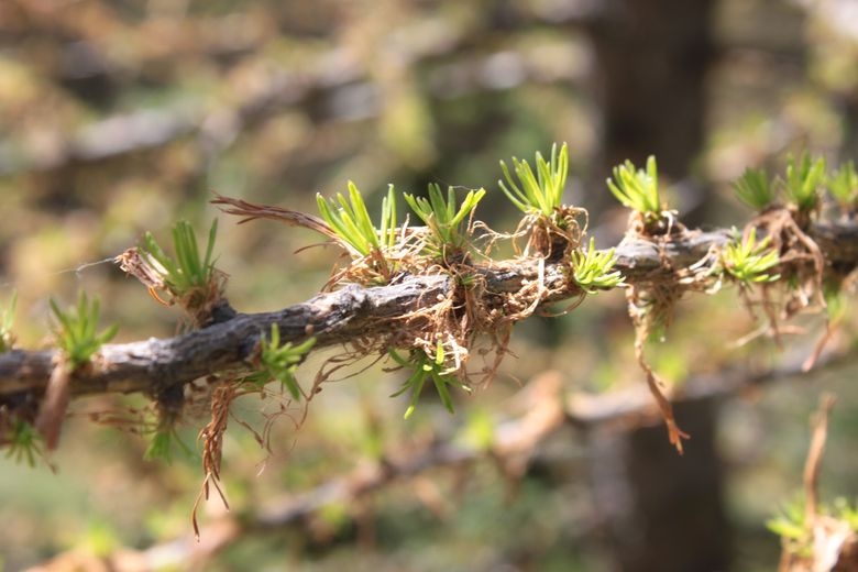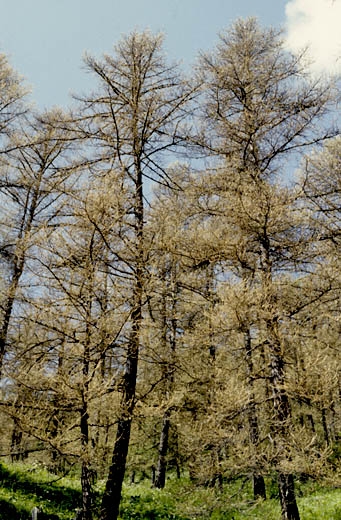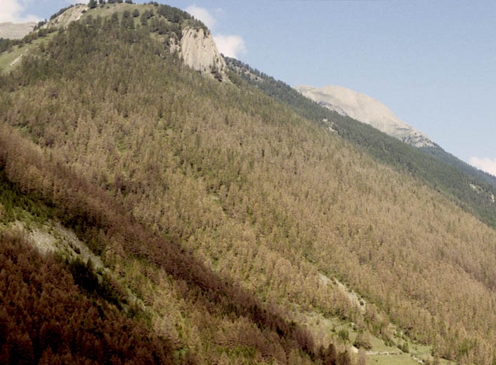 - Le principal dommage subi par les mélèzes consiste en un déficit considérable de la production des graines. On constate aussi un dépérissement de certaines parties des frondaisons des arbres âgés.