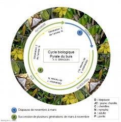 Les papillons femelles dont la durée de vie est d'environ 15 jours, pondent leurs oeufs sur les feuilles de buis. L'évolution larvaire est rapide jusqu'à la dernière génération automnale où les jeunes chenilles s'enferment entre 2 feuilles en tissant une logette en soies (figure 2). Elles se mettent en diapause jusqu'aux premières chaleurs du printemps où elles reprendront leur activité (figures 3).