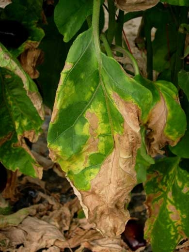 • Causes possibles : nombreux bioagresseurs aériens (virus = CMV, TSWV, TRSV, TNV – figures 1 et 2 ; champignons - figures 3 à 5 ; et bactéries - figure 6 ;  etc.) (Idem sur racines pour les Oomycètes et certains champignons telluriques, voire des nématodes), quelques affections abiotiques (brûlures solaires - figure 7 ; phytotoxicité - figure 8 ; carences ou toxicités - figure 9 ; etc.).