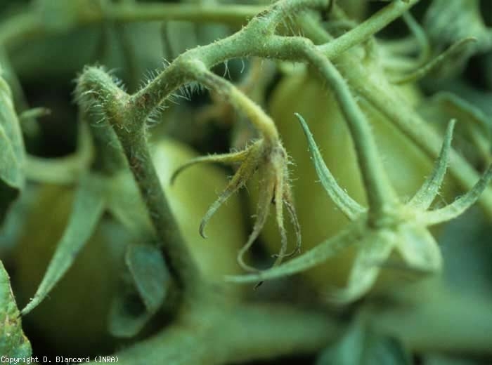 - chute des fleurs et/ou dessèchements floraux : mauvaise nouaison liée à des stress climatiques et/ou à l'absence d'insectes pollinisateurs, lésions florales consécutives au parasitismes de bioagresseurs aériens (champignons, oomycètes, bactéries, voire virus) (figures 1 et 2) ;