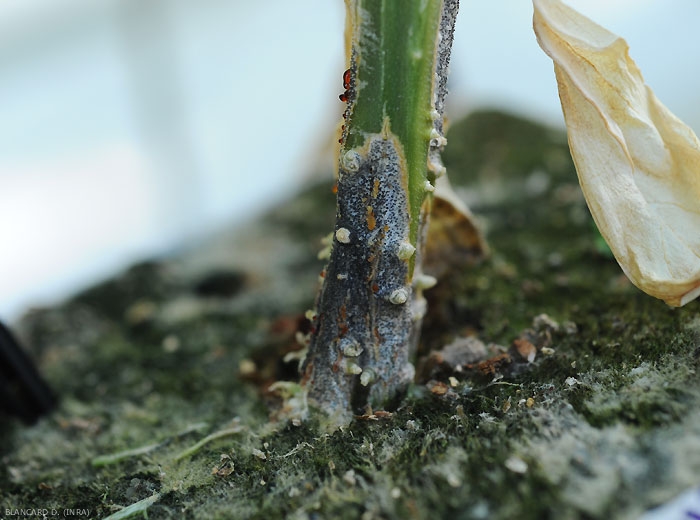 - lésions, pourritures plus ou moins humides, brunes à noires, ceinturant le collet (figures 1 à 5) : plusieurs champignons et Oomycètes telluriques (Rhizoctonia solani, Sclerotium rolfsii, Sclerotinia sclerotiorum, Botrytis cinerea, Didymella spp., Pythium spp., Phytophthora spp., etc.), un excès d'eau, etc. ;