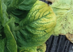 - Description : coloration vert clair à jaune du feuillage liée à un manque de chlorophylle. Lorsque ce composé est totalement absent, les tissus prennent une teinte jaune plus ou moins marquée, voire deviennent blancs. Notons que les jaunissements peuvent se manifester à différents endroits du limbe : en taches dispersées, en périphérie, entre les nervures à partir de celles-ci dans un premier temps, etc.