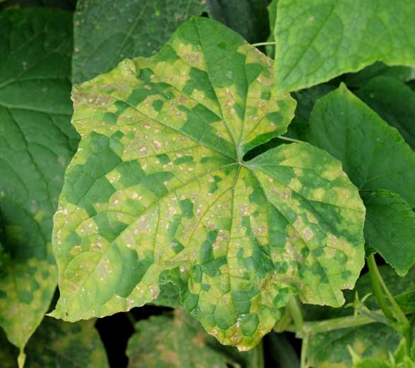 • Description : alternance sur feuilles de zones de coloration vert pâle ou vert foncé et de zones chlorotiques ou jaunâtres. Lorsque la mosaïque est de faible intensité et diffuse, on parle de marbrure (mottle) ; la panachure désigne une mosaïque bien marquée avec une alternance des plages aux couleurs différentes et aux contours nettement définis. Sous l’appellation mosaïque sont aussi regroupés une multitudes de symptômes souvent associés aux viroses : taches annulaires, arabesques, lésions digitées ou en forme de feuilles de chêne...